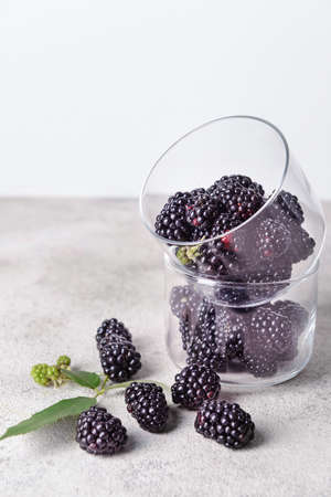 Glass bowls with tasty blackberries on gray table