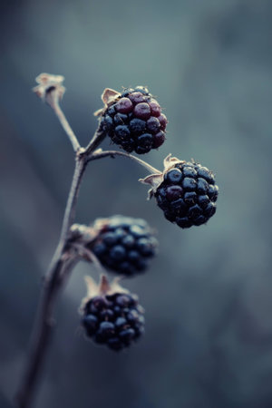 Ripe blackberries hanging on a dry branch against a dark blurred forest background. Natures fruits reflecting autumns beauty and richness.