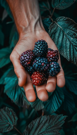 Close up of fresh blackberries nestled among lush green foliage in a vibrant garden setting