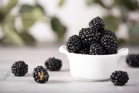 large ripe blackberry in a white bowl on table