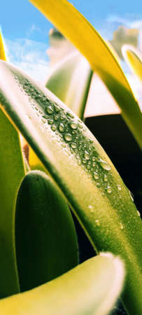 Macro closeup of Beautiful fresh green leaf with drop of water after the rain in morning sunlight nature background.