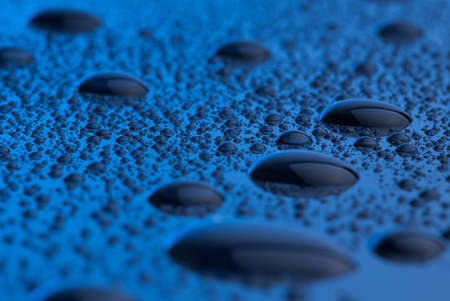 Bright blue background, crystal clear drops (raindrops). Abstract pattern, wallpaper, concept art. Glitter, paint texture. Graphic resources, design, 3D, macrophotography, environment, water treatment