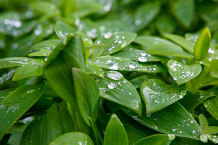 Large beautiful drops of transparent rain water on a green leaf macro. Beautiful leaf texture in nature. Natural background,