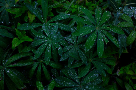 Bright green leaf displays numerous water droplets, reflecting light after a refreshing rain shower.