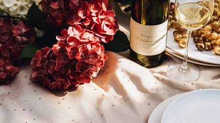 Wedding or formal dinner holiday celebration tablescape with hydrangea flowers in the English countryside garden, table setting and wine, floral table decor for family dinner party, home styling inspiration