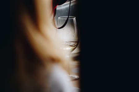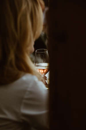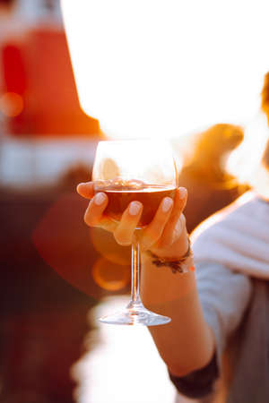 Vertical image cropped woman hand hold wineglass on vacation in travelling. Remember weekend forever. Female addiction