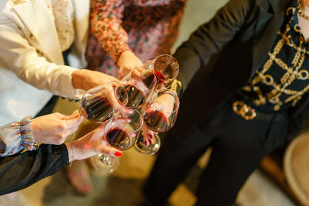 Close up on hands of unknown women holding a glasses of red wine toasting