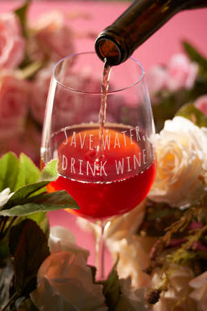 Wine glass with red wine and with the inscription Save water, drink wine stands against a background of flowers and a pink background