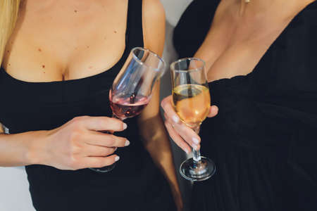 Glass wine glasses with red wine in the hands of two girls in evening black dresses against the background of their legs. Party theme.