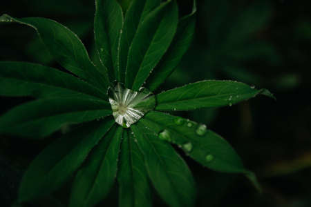 A detailed close up shot of a fresh green plant leaf covered in sparkling water drops after rain. A large central droplet reflects the light and its surroundings beautifully.