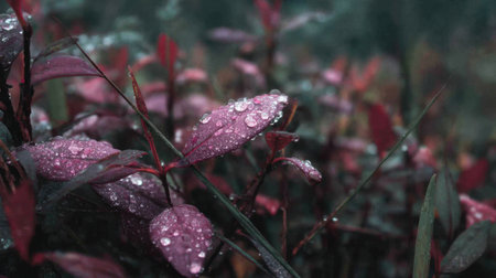 Macro purple leaf water drops. Spring plant. Generate Ai