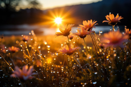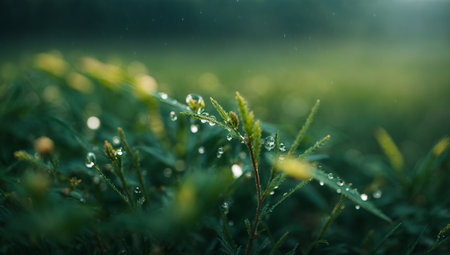 wet grass glistening under the sun's rays, creating an atmospheric and dreamy scene. the light yellow and light emerald hues enhance the ethereal feel. water drops add a touch of freshness to the composition. this captivating photo captures the artistic style of miwa komatsu and jessica drossin, showcasing their unique approach to capturing nature's beauty. ai generated