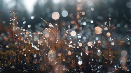 Detailed view of a plant covered in glistening water droplets, reflecting light in a summer morning.