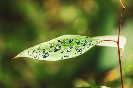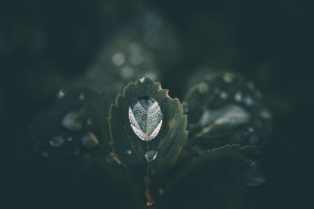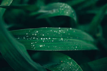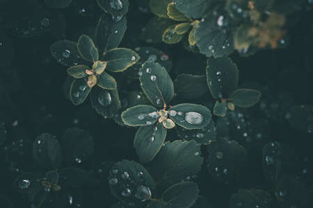Macro photograph of wet green leaves covered in raindrops with soft bokeh background
