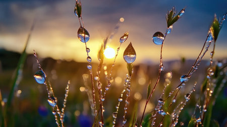 Dew drops on grass at dawn with intricate details and vibrant colors