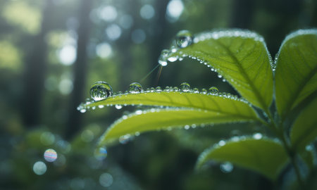 Fresh green leaves covered in sparkling dewdrops, reflecting light in a natural forest setting. symbolizing purity, growth, and the beauty of nature.