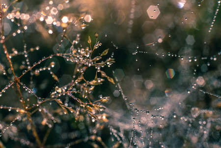 Macro shot of a spiderweb adorned with many dewdrops, reflecting the surrounding green foliage and creating a bokeh effect.