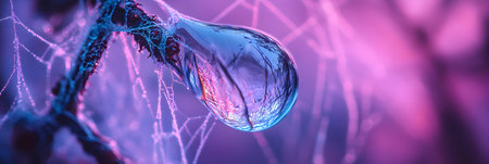 Vibrant Purple Blue Dewdrop on Spiderweb Nature Macro Photography Water Image Bokeh Light Shiny