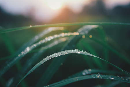 Macro closeup of Beautiful fresh green grass with drop of water after the rain in morning sun nature background.