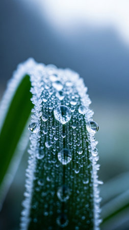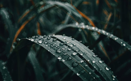 AI generated macro scene of clear round dew droplets resting on a deep green grass blade creating a calm fresh and slightly mysterious atmosphere with soft depth and natural detail