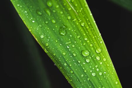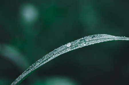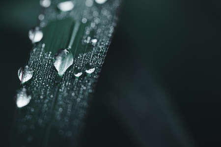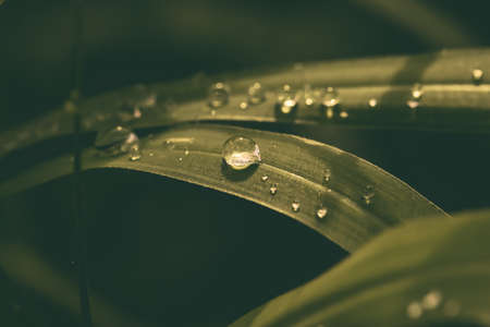 Beautiful large drops of fresh clean transparent water on grass leaves in the morning in a dark style, macro. Grass in the morning dew in spring summer on a green background in nature