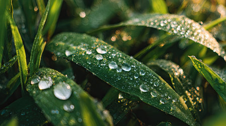 This close-up image captures dew drops resting on green grass leaves, highlighting the beauty of nature in soft morning light and a blurred aesthetic.