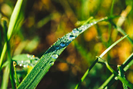 Dew grass early morning. Beautiful emerald color of summer grass. Abstract natural background, beautiful bokeh. The concept of freshness, environmental protection, cleanliness. Macro of water drops.