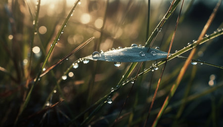Vibrant green meadow, dew drops on blades, nature beauty shines generated by artificial intelligence