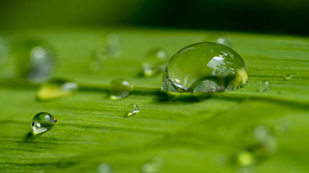 Closeup of waterdrops rolling on green leaves in the garden after rain