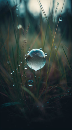 Delicate water droplets representing conservation floating gently through lush greenery. Generative AI