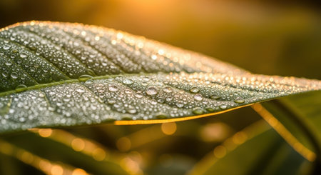 This close-up photograph captures water droplets on a leaf, illuminated by golden light, showcasing the intricate details and textures of nature. Perfect for nature themes.