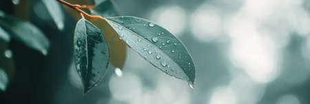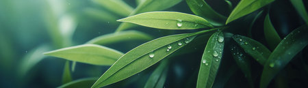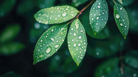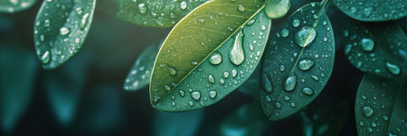 A close-up shot capturing fresh green leaves adorned with glimmering water droplets, creating a serene and vibrant atmosphere ideal for nature lovers and enthusiasts.