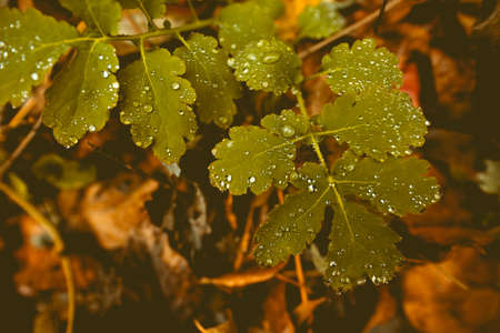 Raindrops on a leaves at november day - vintage style
