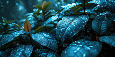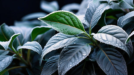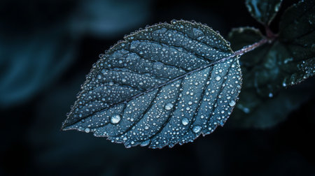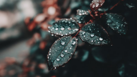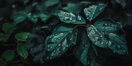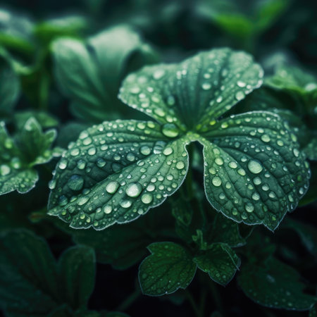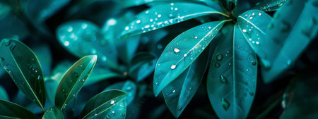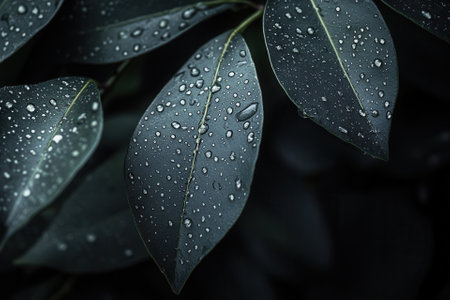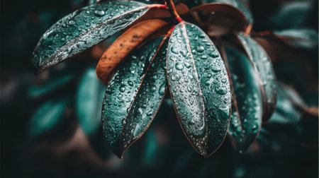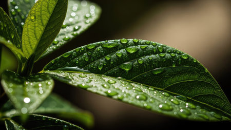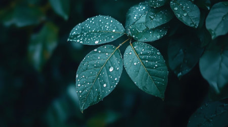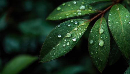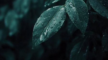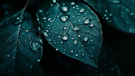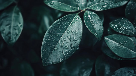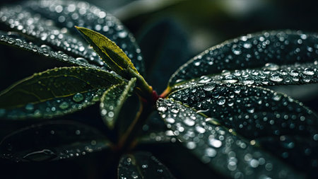 A detailed image showcases a plant with dark green leaves, each adorned with numerous water droplets. The composition uses selective focus and natural lighting. The textures and color contrast create visual interest. Suitable for various design projects, nature-themed articles, and potentially, advertising purposes.
