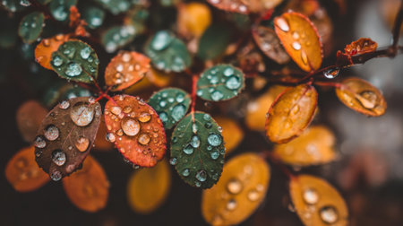 A macro photograph of plant leaves glistening with fresh raindrops. The background is a soft blur of autumn colors, highlighting the detailed texture of the foliage.