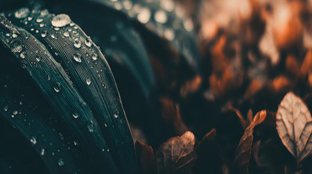 Macro photograph of water droplets on dark green leaves. The background is a beautiful bokeh of warm autumn colors, creating a moody and natural atmosphere.