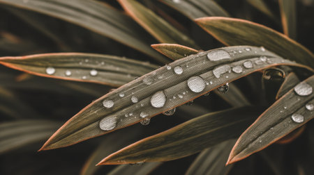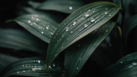 A macro photograph capturing delicate water drops resting on the surface of long green leaves after a rain shower creating a fresh and tranquil natural background.