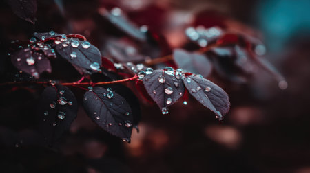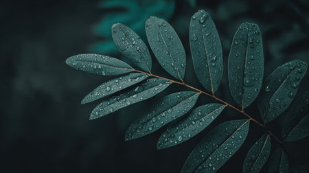 A macro photograph of a plant branch with dark teal leaves covered in water drops. The moody, dark, and blurred background creates a calm and natural atmosphere.