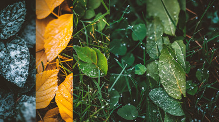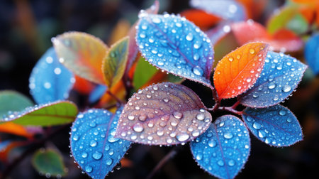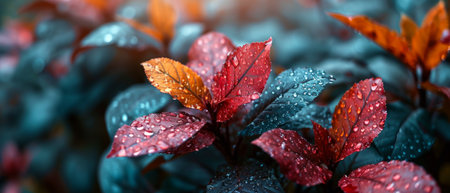 This close-up image showcases colorful leaves adorned with water droplets, highlighting nature's beauty after rainfall. The vivid hues and textures create a refreshing scene perfect for nature-themed projects.
