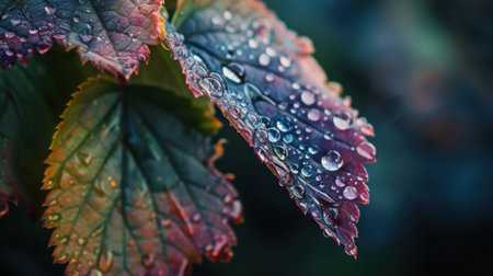 Captivating close-up of leaves adorned with glistening water drops, showcasing nature's beauty at twilight in vibrant colors and intricate details.