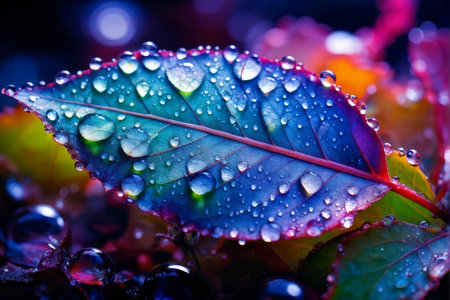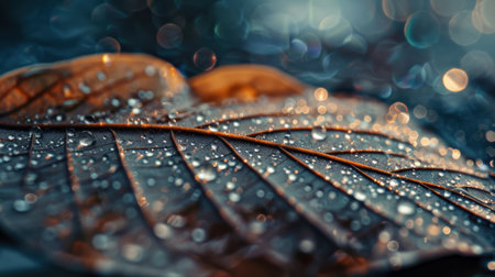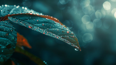 A stunning close-up of a leaf covered in water droplets, showcasing intricate details and vibrant colors. The bokeh effect in the background enhances the natural beauty, ideal for themes of nature and