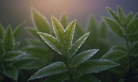 An AI generated illustration of a close-up of a vibrant green plant with dew droplets on its leaves