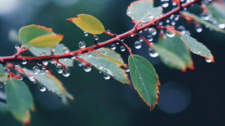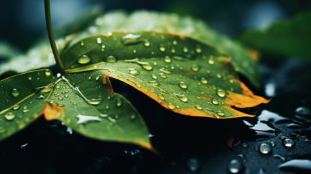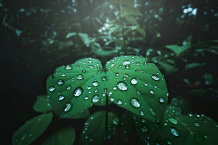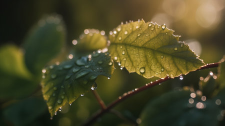 CloseUp of Two Leaves with Water Droplets A Mysterious Wet Scene under Early Morning Sunlight