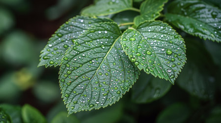 A captivating close-up view of green leaves adorned with glistening raindrops, showcasing the intricate textures and vibrant colors of nature. Perfect for eco-themed projects.