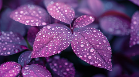A close-up image of purple leaves covered in dewdrops.