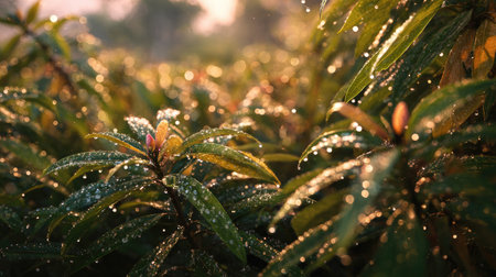 A macro shot of fresh green leaves with rain droplets glistening on the surface, creating a serene and refreshing tropical scene with natural textures and details.