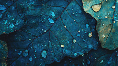 This captivating close-up captures water droplets resting on a leaf surface, showcasing intricate textures and patterns illuminated by soft natural light.