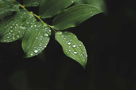 Green leaves with water drops after rain in the morning. Nature background