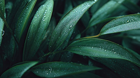 A stunning close-up view of green leaves adorned with water droplets, creating a refreshing and tranquil atmosphere, perfect for nature-themed projects.