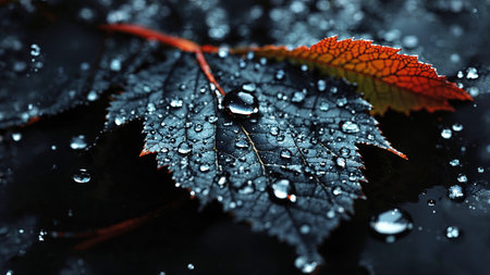 Dark leaves with vivid orange accents are glistening with raindrops, creating a striking contrast. This captures the beauty of nature in a moist environment.